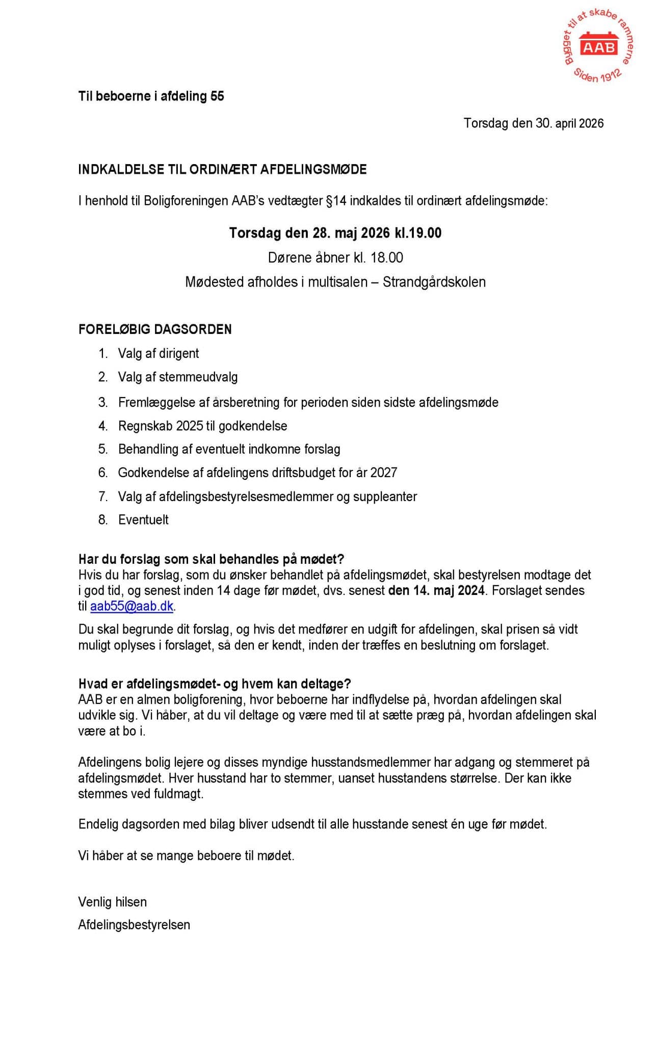 AAB55 Kontor & Telefontider: Vigtig: Husk kontakt info i emailen Hurtigst betjening for beboer er via e-mail